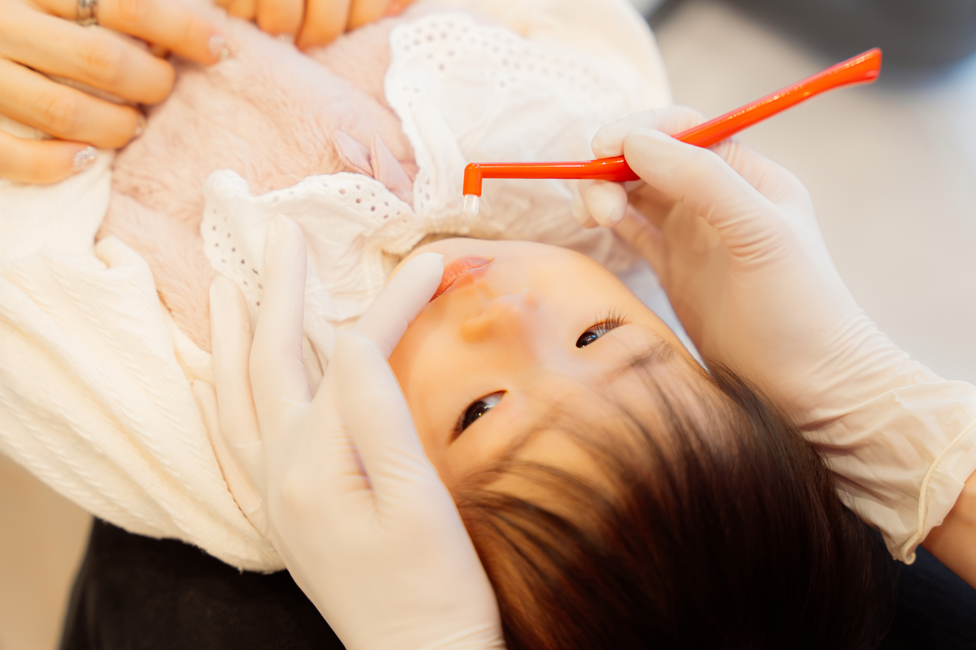 フッ素には歯を強くし、むし歯を防ぐ働きがあります。特に乳歯はむし歯になりやすいため、3〜6ヶ月ごとのフッ素塗布でむし歯リスクを軽減します。